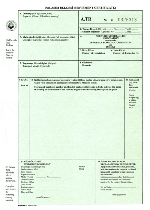 A.TR belgesi Avrupa Topluluğu ile Türkiye arasındaki Serbest Ticaret Anlaşmasına istinaden, Avrupa Topluluğu’na dahil, A bendinde listesi verilen ülkelerle aramızdaki ticarette, serbest dolaşımda bulunan eşya (Türkiye veya topluluk menşeli olan veya üçüncü ülke menşeli olup Türkiye veya toplulukta ithal işlemleri tamamlanmış, gerekli gümrük vergisi, eş etkili vergi ve resimleri tahsil edilmiş, bu vergi veresimleri tam veya kısmi bir iadeden yararlanmamış eşya) için, ihracatçı firma tarafından düzenlenen belgedir. Avrupa Topluluğu ülkelerine sanayi ürünü ve işlenmiş tarım ürünleri ihracatı için kullanılır. İhracatçı firmanın bağlı bulunduğu Ticaret veya Sanayi Odası tarafından tasdiklenip, Gümrük İdaresince vize edilir.