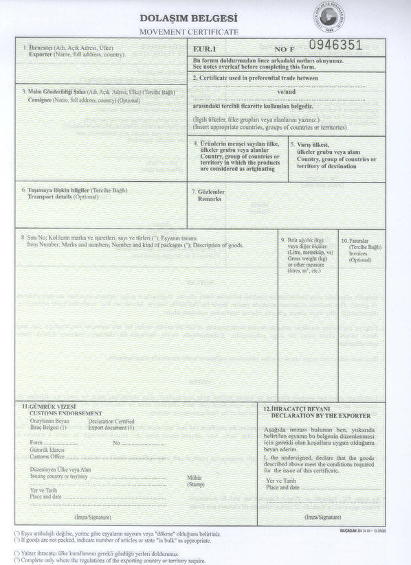 EUR.1 Dolaşım Belgesi, Türkiye veya Gümrük Birliği tarafından ikili serbest ticaret anlaşması yapılan ülkelere, AB ülkelerine yapılan işlenmemiş tarım ürünleri (konserve, turşu, kapari, kurutulmuş domates ve salça gibi) ayrıca bu belge AKÇT (demir, çelik) ürünleri için kullanılmaktadır.