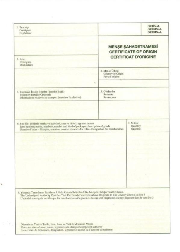 Menşe Şahadetnamesi, eşyanın tercihli olmayan menşe statüsünü kanıtlamaya yarayan bir belgedir. EUR.1 Dolaşım Sertifikası, sertifikası muhteviyatı eşyanın anlaşma kuralları çerçevesinde menşeli olduğunu gösteren, ihracatçı tarafından doldurulduktan sonra Ticaret/Sanayi Odaları tarafından gerekli kontroller yapılarak tespit edilen ve gümrük idaresince vize edilmesini müteakip geçerli olan menşe ispat belgesi olup aramızda tercihli ticaret anlaşması olan ülkelerle yapılan ticarette indirimli tarifeden yararlanmayı sağlar.